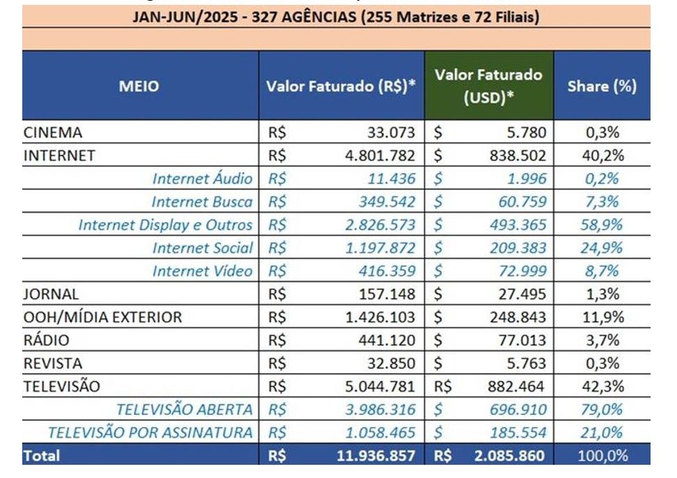 Os investimentos em publicidade no primeiro semestre de 2025 cresceram 12,52% em relação ao mesmo período de 2024. O volume acumulado chegou a R$ 11,93 bilhões, aproximadamente R$ 1,32 bilhão a mais do que o registrado entre janeiro e junho do ano passado.