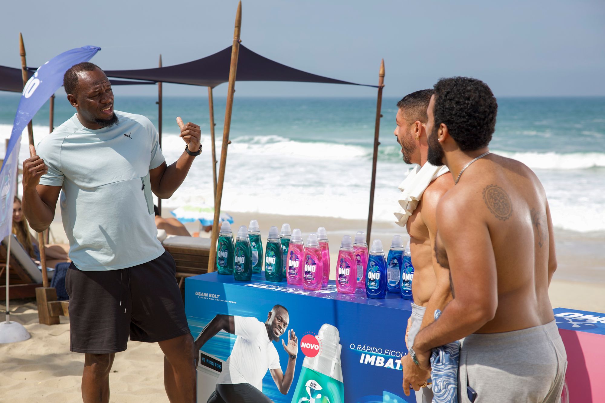 A cena mostra os personagens César (Cauã Reymond) e Olavo (Ricardo Teodoro) se preparando para uma corrida na praia quando se deparam com Bolt promovendo o novo OMO Ciclo Rápido em um quiosque à beira-mar.