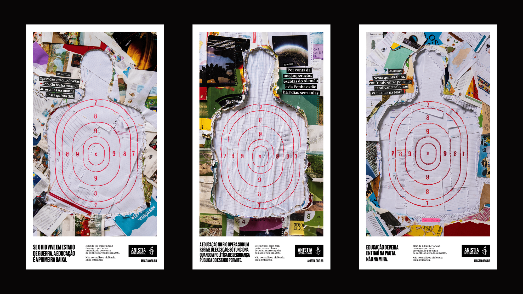 Criada pela Africa Creative, a iniciativa utiliza mobiliário urbano e peças de mídia out-of-home (OOH) para chamar atenção ao tema. As instalações exibem materiais escolares que seriam usados em sala de aula, mas aparecem transformados em alvos de tiro, em referência às aulas canceladas por conta da violência e ao impacto direto no aprendizado de milhares de estudantes.